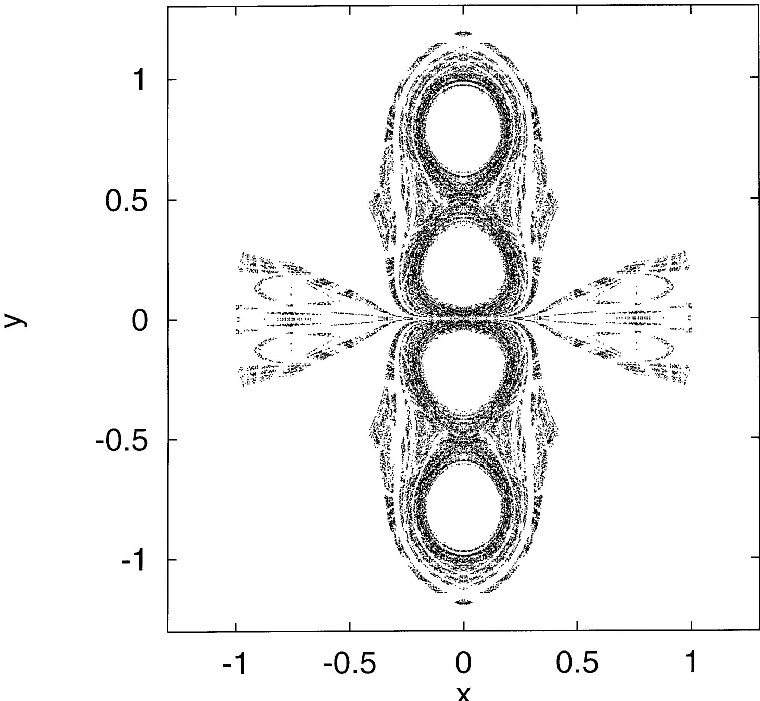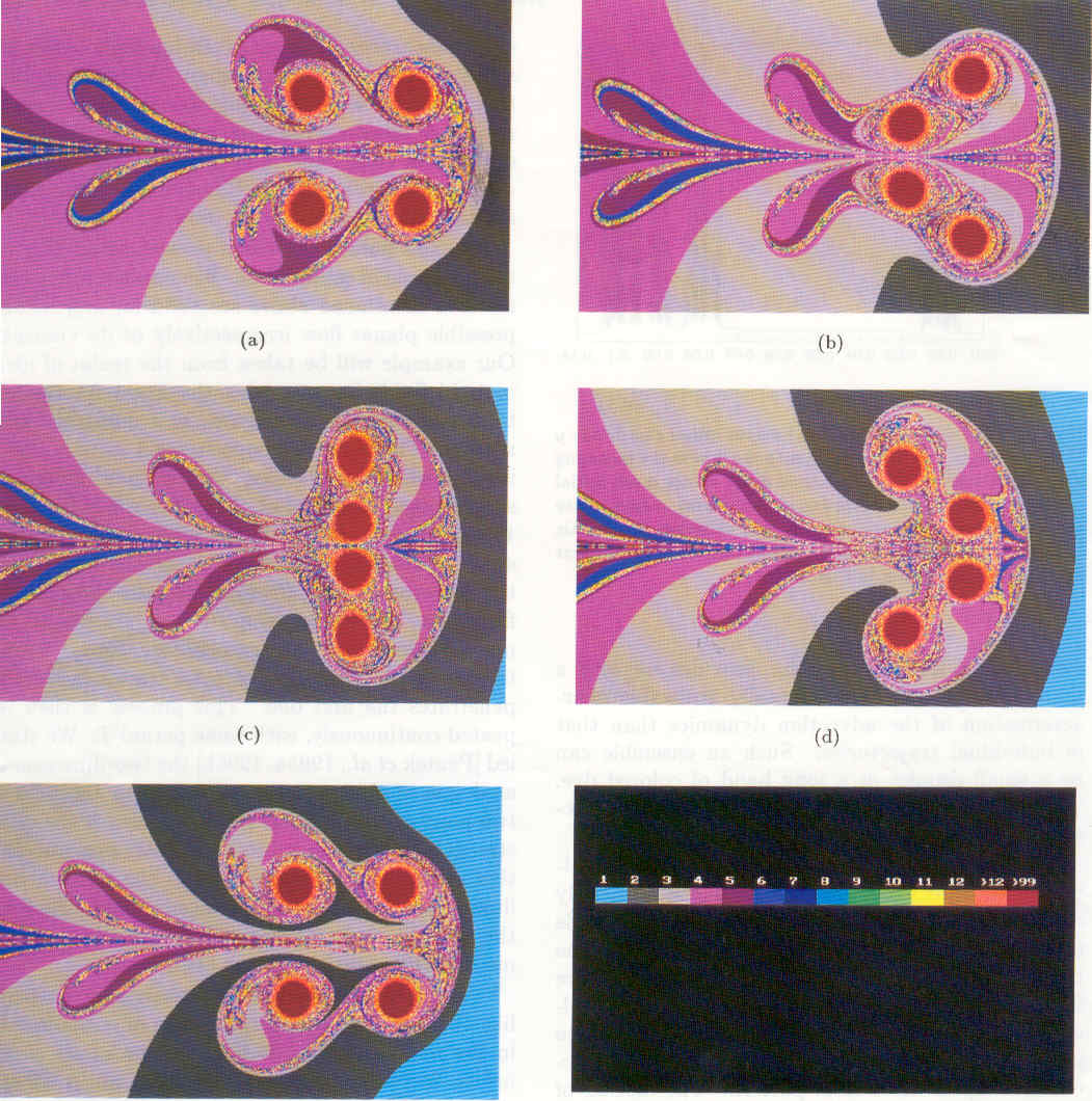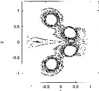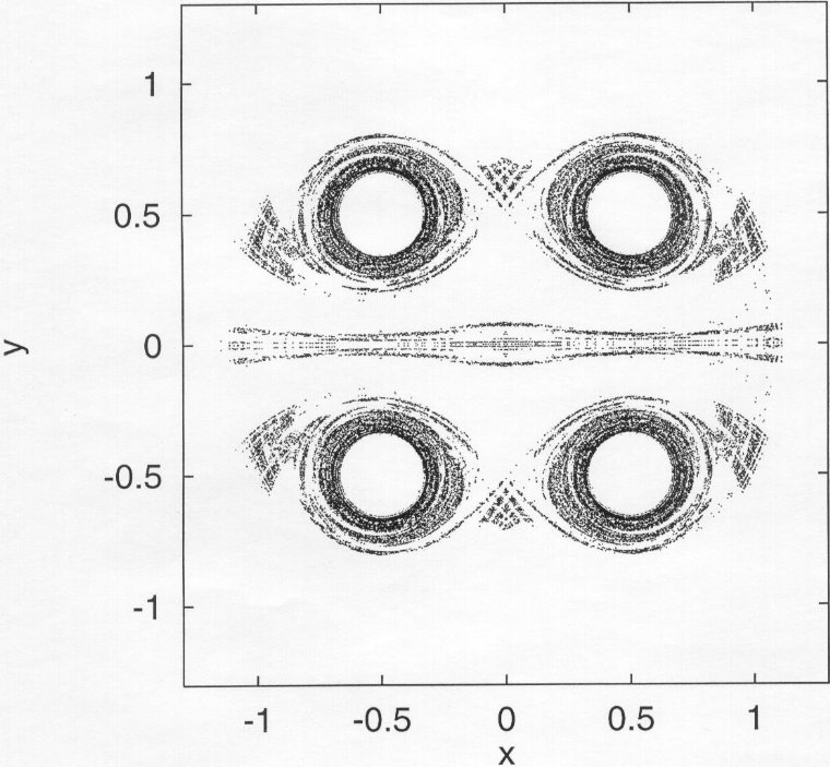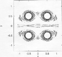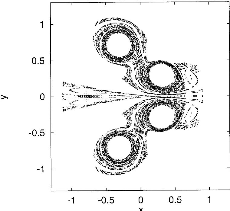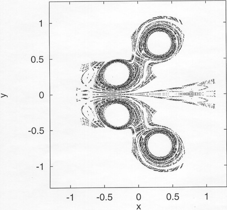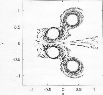 | The non-attracting chaotic set of the two leapfrogging vortex pairs at four different instants within one period. | |