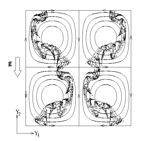 | Picture of the attractor located at infinity in four counter rotating vortex cells. The level curves of the stream function are plotted for reference. |